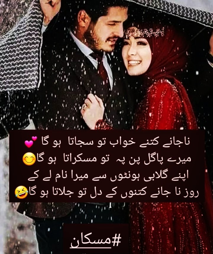Najana kitna khwab tu sjata ho ga…Mara pagal pan pa tu muskrata ho ga πππApna gulabi aunntoo sa mara nam la k …Roz najana kitnoo k dil tu jlata ho gaπππ